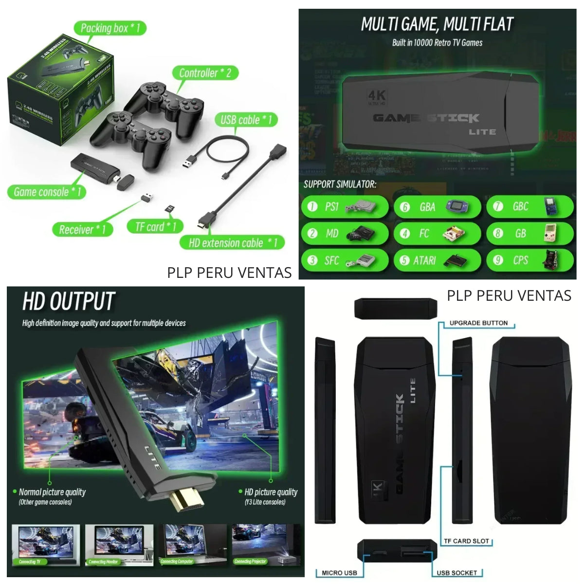 Incluye 2 mandos inalámbricos, game stick, receptor, tarjeta TF, cable USB y manual.